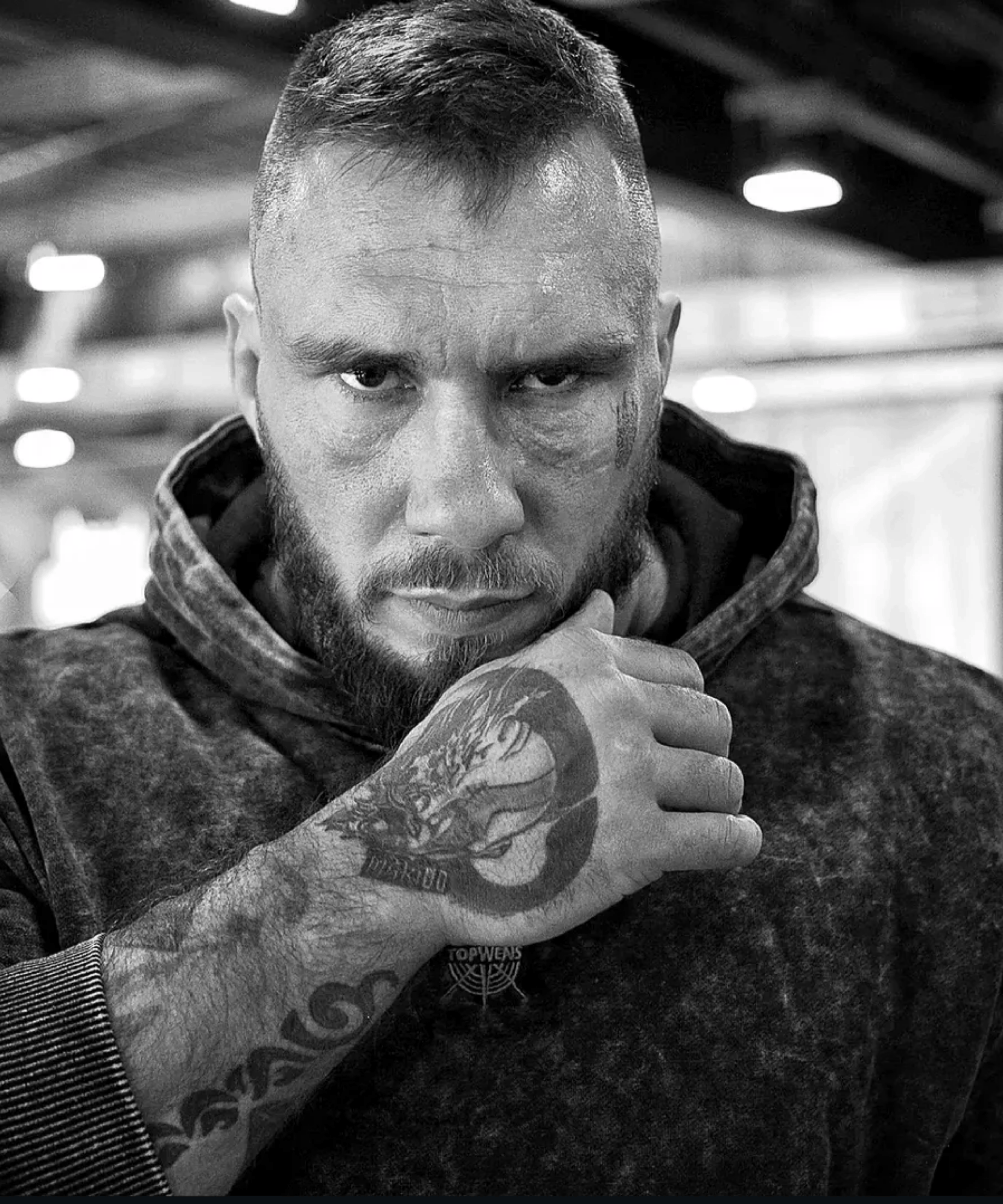 Created under an official licensing agreement between TopdogsRRN and Kratos himself this limited edition cinematic artwork captures the dual identity of the man — the modern bare knuckle warrior below and his mythological God of War counterpart above. The shared tattoos the shared facial features the shared hand position — every detail deliberately chosen to communicate one undeniable truth. These are not two different warriors. This is one warrior existing simultaneously across two different worlds and two different lifetimes.